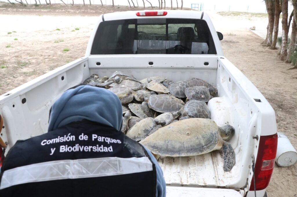 La Comisión de Parques y Biodiversidad de Tamaulipas, rescató ejemplares juveniles de tortuga verde en la playa La Pesca, en el municipio de Soto la Marina, varadas por inmovilidad que provoca las bajas temperaturas.