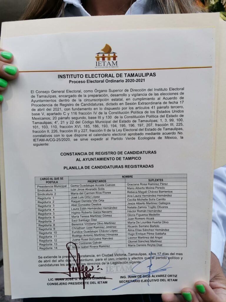 Al recibir la constancia del IETAM que acredita su candidatura así como la planilla de sindicos y regidores, la abanderada del Partido Verde a la alcaldía de Tampico, Gema Acosta, manifestó que son perfiles nuevos con las ganas de trabajar y hacer el bien por las familias.