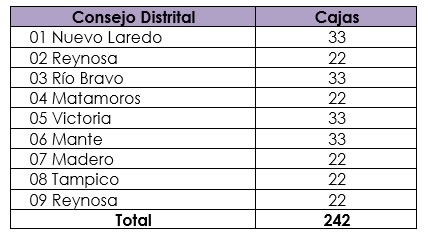 El sábado 1° de mayo del presente año, en las oficinas de la Vocalía del Registro Federal de Electores (RFE) en Ciudad Victoria, se entregaron las 242 cajas conteniendo las Listas Nominales de Electores Definitivas con Fotografía (LNEDF), a los Consejos Distritales, mismas que serán utilizadas durante la jornada electoral del próximo 6 de junio, en cada una de las 4 mil 775 casillas que se instalarán en Tamaulipas.