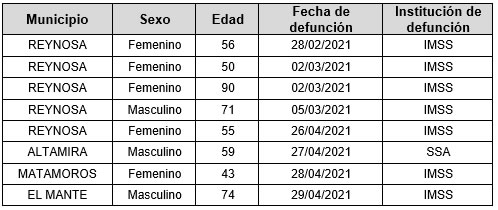 CIUDAD VICTORIA, Tamaulipas.- En su reporte COVID-19 de este jueves, la secretaria de salud de Tamaulipas, Gloria Molina Gamboa confirmó 95 nuevos casos de la enfermedad y 8 fallecimientos, por lo que pidió a la ciudadanía respetar las medidas de prevención ya conocidas.