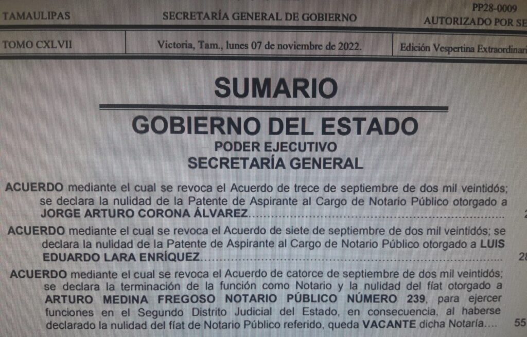 Ciudad Victoria, Tamaulipas.- Por no cumplir con los requisitos exigidos por la ley y por no garantizar la impartición de una función notarial que atienda al orden público e interés social, el Gobierno del Estado publicó en el Periódico Oficial, la nulidad de la Patente de Aspirante a Notario Público otorgada a Jorge Arturo Corona Álvarez y a Luis Eduardo Lara Enríquez, y además canceló el fíat otorgado a Arturo Medina Fregoso como Notario Público número 239.